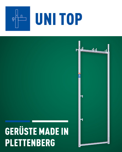 Unser Fassadengerüstsystem UNI TOP erfüllt die Forderungen der Berufsgenossenschaft und verfügt über die Allgemeine bauaufsichtliche Zulassung des Deutschen Instituts für Bautechnik Berlin Z-8.1-902.